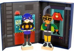 Questo ingegnoso set magnetico garantisce ore di divertimento e possibilità di combinazione infinite. Con 27 magneti potete creare oltre 80 costumi diversi – dagli audaci supereroi a varianti buffe che stimolano la fantasia dei bambini. Le due grandi figure possono essere inserite nelle basi in legno incluse, così i bambini possono sia giocare al tavolo che esporre le loro creazioni.