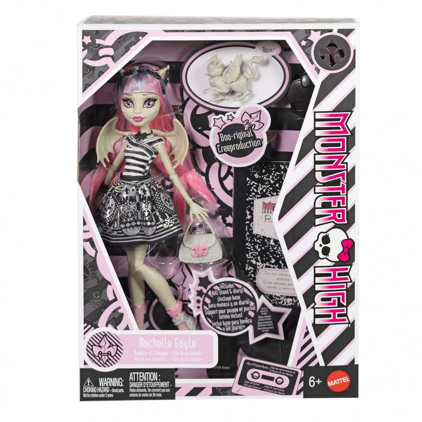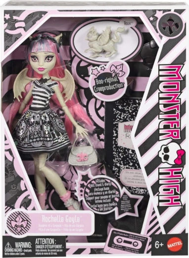 Torna nel mondo di Monster High con il ritorno dell’iconico personaggio Rochelle Goyle. La bambola spicca per il top a righe bianco e nero, la minigonna metallica e gli accenti rosa che si abbinano ai suoi lunghi capelli rosa. Il trucco dettagliato, gli accessori e le ali iconiche definiscono l’inconfondibile stile “scaris”.
