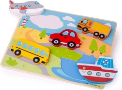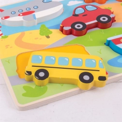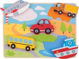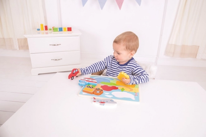 Divertente puzzle a incastro in legno con mezzi di trasporto per i più piccoli. Contiene 5 grandi pezzi con impugnatura, che i bambini inseriscono facilmente nelle aperture corrette. Supporta la motricità fine, le capacità di coordinazione, l'apprendimento di forme e colori e lo sviluppo del vocabolario. Realizzato in legno di qualità e conforme alle norme di sicurezza europee.