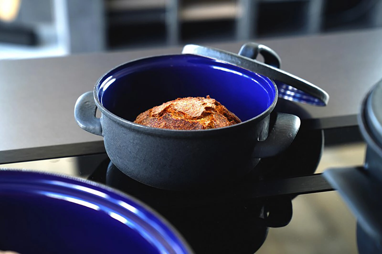 Lo speciale smalto blu, altamente resistente agli acidi, rimane a lungo come nuovo, non assorbente e igienico – ideale per salse, zuppe e cotture al forno.