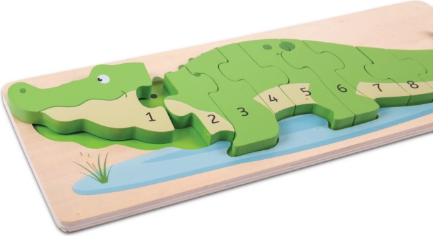 Colorato puzzle in legno a forma di coccodrillo che insegna ai bambini i numeri da 1 a 10 in modo giocoso. 10 pezzi robusti con numeri e indicatori a puntini favoriscono il conteggio, la motricità fine, le connessioni logiche e la concentrazione. Realizzato in legno di qualità, conforme alle norme di sicurezza europee.