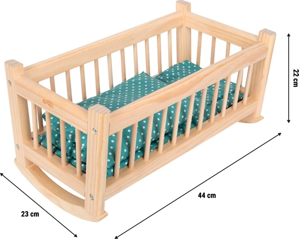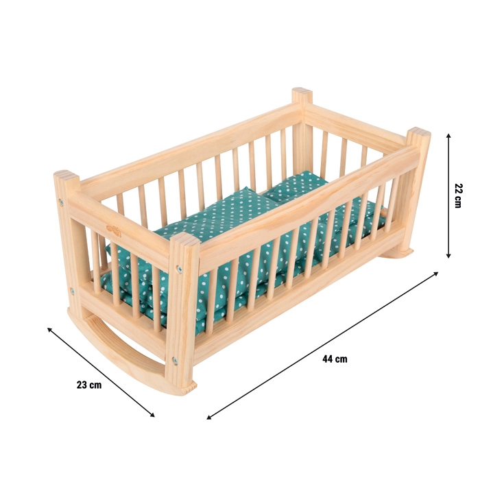 Questa culla in legno naturale è l’accessorio ideale per la cameretta dei bambini e per la casa delle bambole. Il telaio stabile assicura un dondolio fluido che tranquillizza bambole e amici di peluche fino a 39 cm. Il set include una biancheria tessile coordinata dal design delicato per il massimo comfort.