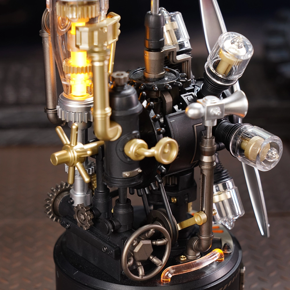 Esplora l’armonia tra ingranaggi, pistoni e “motore” radiale. Una volta assemblato, si mettono in rotazione l’elica anteriore e il rotore superiore, offrendo un movimento coinvolgente e realistico.