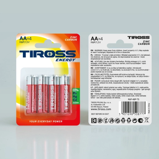 Queste classiche batterie AA (R6) al zinco-carbone offrono prestazioni stabili per dispositivi a basso e occasionale consumo. Sono ideali per telecomandi, orologi da parete, calcolatrici e giocattoli semplici.