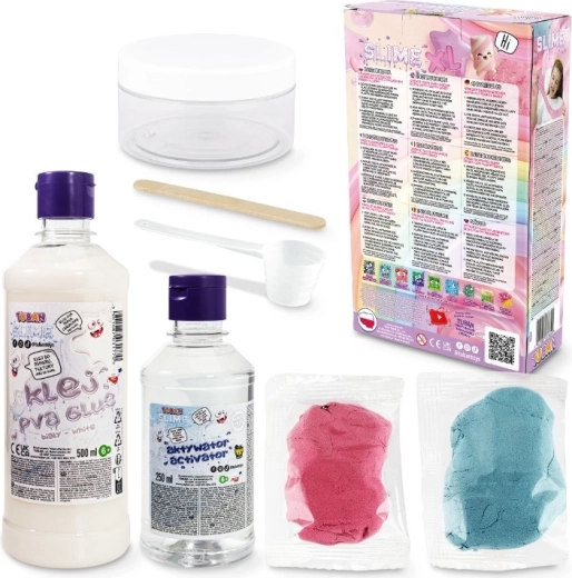 - 500 ml di colla PVA bianca, 250 ml di attivatore, 25 g di sabbia fluffy rosa, 25 g di sabbia fluffy blu, spatola, misurino da 50 ml, contenitore per la conservazione