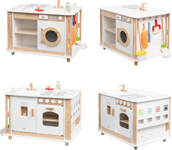 I dettagli realistici e la ricca dotazione (utensili da cucina, alimenti, “prodotti per la pulizia”, ferro e asse da stiro, set di strumenti per le pulizie) stimolano l'immaginazione e sviluppano abilità pratiche. La struttura a isola favorisce l'interazione di più bambini contemporaneamente e insegna collaborazione, organizzazione e sensibilità ecologica.