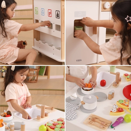 Questo centro domestico in legno 3 in 1 Viga trasforma la cameretta in un ambiente vivace ricco di imitazioni delle attività quotidiane. I bambini possono cucinare al fornello con manopole, cuocere nel forno, “lavare” i vestiti nella “lavatrice”, lavare i piatti nel lavello e imparare a differenziare i rifiuti con pezzi contrassegnati a colori. Grazie alle due ruote pivottanti, l'intera postazione è facile da spostare ed è perfetta per il gioco condiviso.