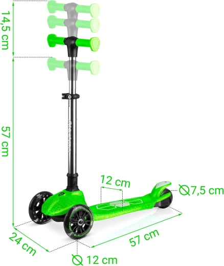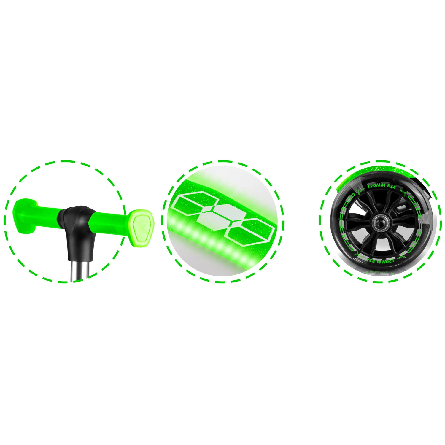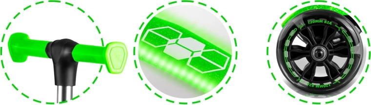 - Visibilità e divertimento: ruote anteriori LED e pedana LED senza bisogno di batterie (dinamo).