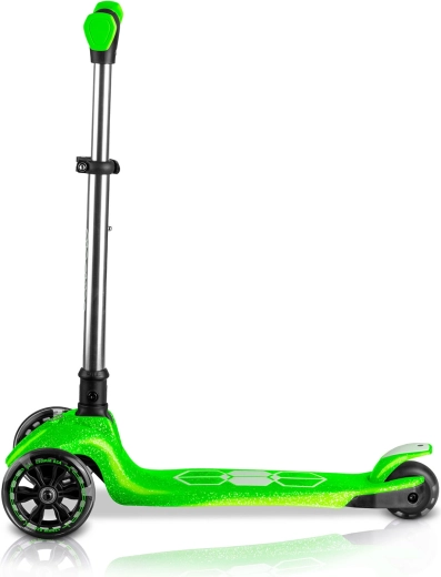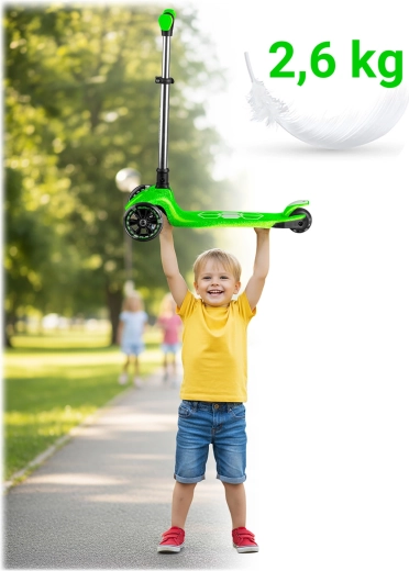 La sicurezza è garantita da un pianale antiscivolo, un efficace freno posteriore a pedale e dalle ruote LED con dinamo abbinate alla retroilluminazione LED della pedana per una migliore visibilità al crepuscolo. Il manubrio a regolazione d’altezza in alluminio consente di adattare il monopattino alla crescita del bambino, così da durare per più stagioni.