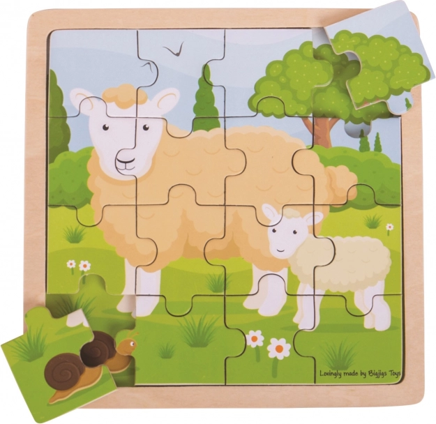 Questo puzzle in legno con cornice di BIGJIGS TOYS propone un tenero motivo di una pecora con il suo agnellino che conquisterà i bambini al primo sguardo. I pezzi si assemblano direttamente nella cornice su un fondo con lo stesso motivo, così l'immagine non si sposta e i bambini vedono facilmente dove va ogni pezzo.