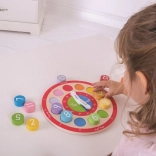 I tasselli rotondi con i numeri 1–12 si inseriscono nelle sedi abbinate per colore, favorendo il riconoscimento di colori e forme e allenando la motricità fine.