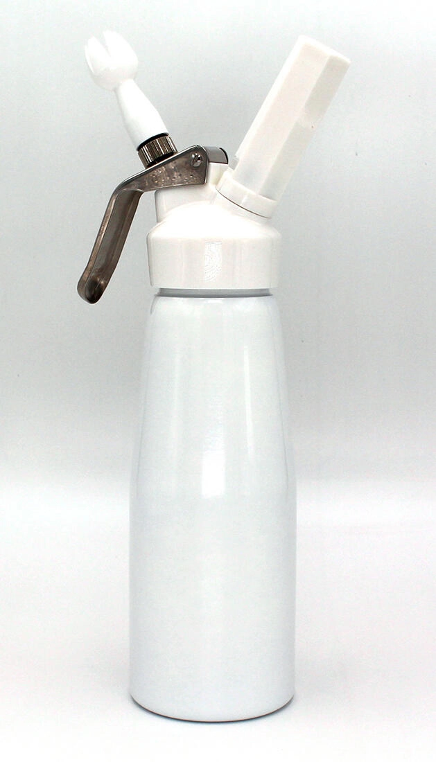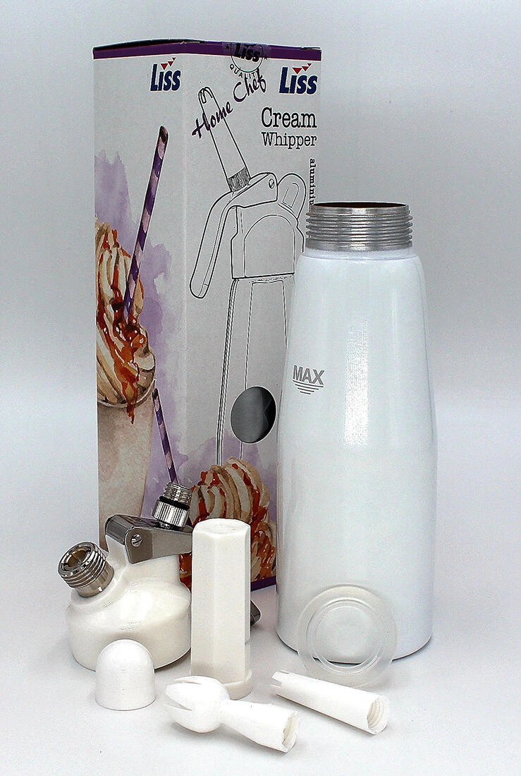 Scopri la comodità della preparazione domestica della panna con la bottiglia LISS Home Chef da 0,5 l. Il corpo in alluminio con vernice bianca e il rivestimento interno assicurano lunga durata e facile manutenzione. La quantità consigliata di panna da 250 a 400 ml offre una sofficità ottimale; il volume massimo della miscela è di 500 ml.