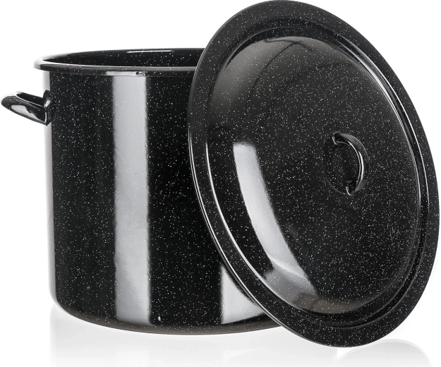 Pentola smaltata ad ampio volume con coperchio, capacità 17 l e diametro 30 cm, ideale per cucinare zuppe, brodi, pasta o per la sterilizzazione. La superficie smaltata resistente si pulisce facilmente e distribuisce il calore in modo uniforme. Adatta a tutti i tipi di piani cottura tranne l’induzione.