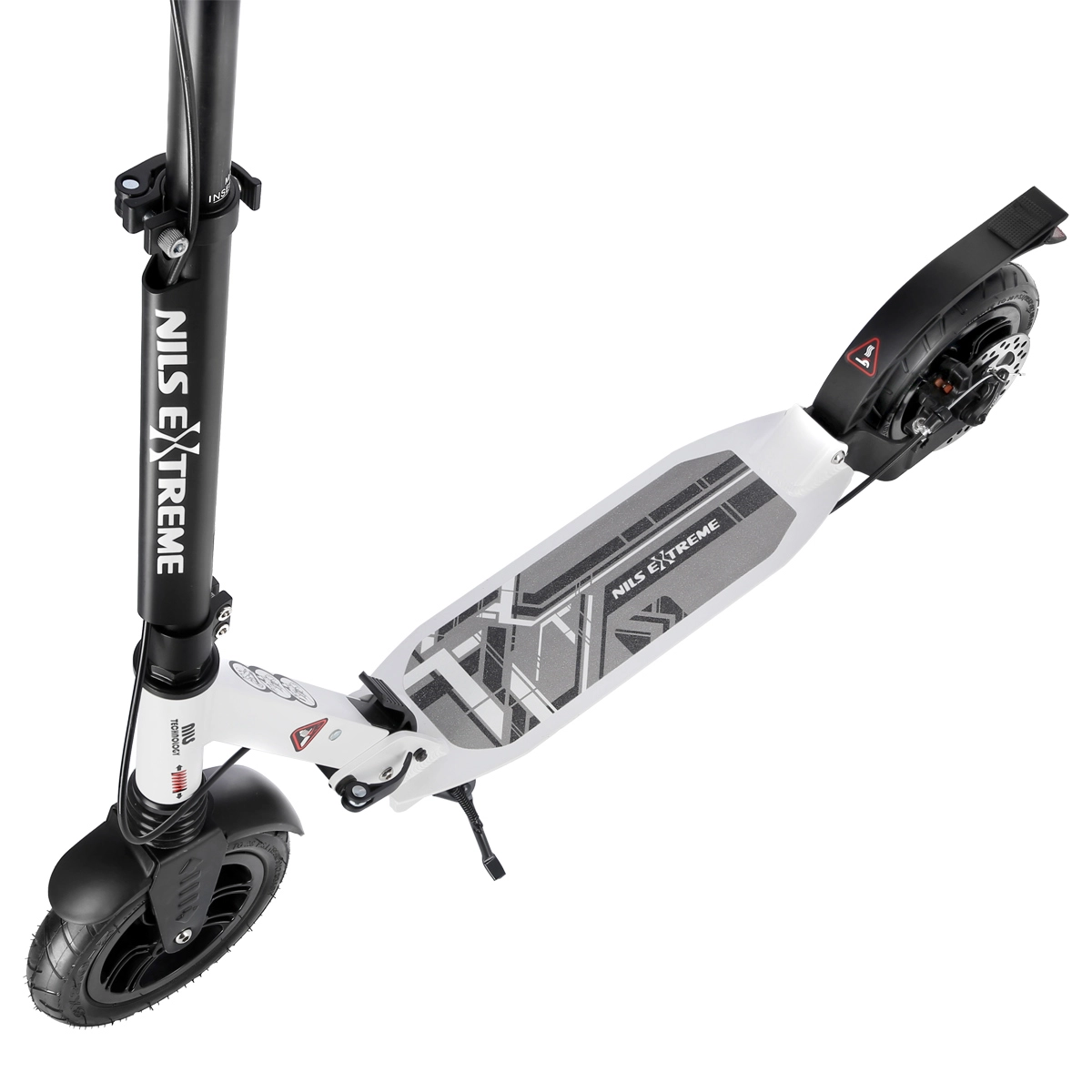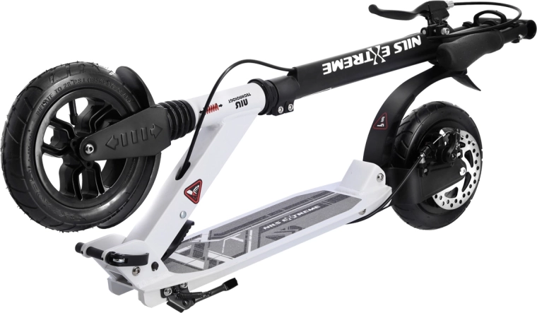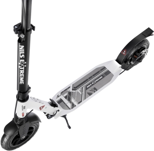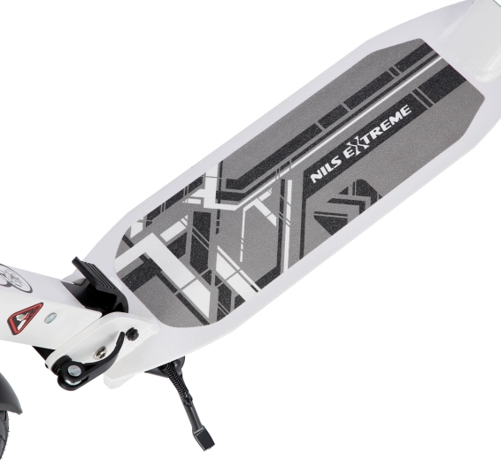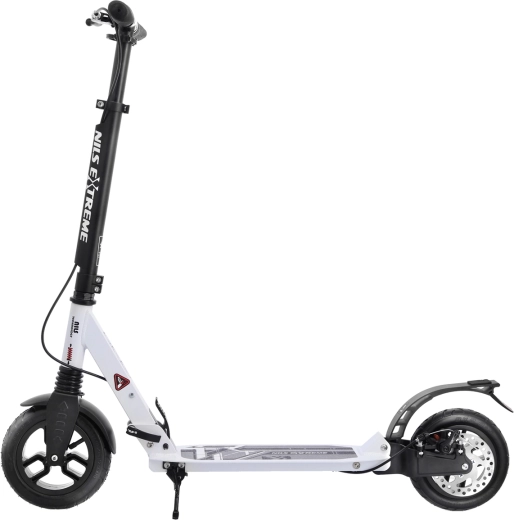 La sicurezza è incrementata dal freno a disco posteriore azionato da una leva sul manubrio e abbinato al parafango a pressione. Le ruote pneumatiche da 200 mm con cuscinetti ABEC 9 garantiscono accelerazione rapida, stabilità e scorrevolezza. Manopole in gomma, pratico cavalletto pieghevole e parafango sulla ruota anteriore completano una dotazione confortevole.
