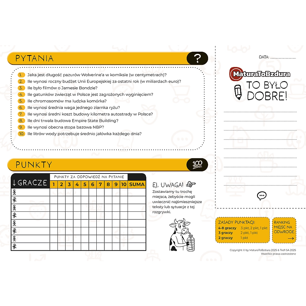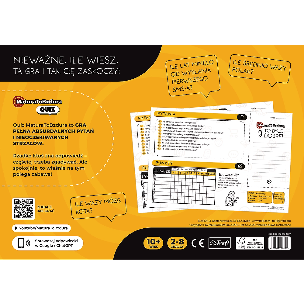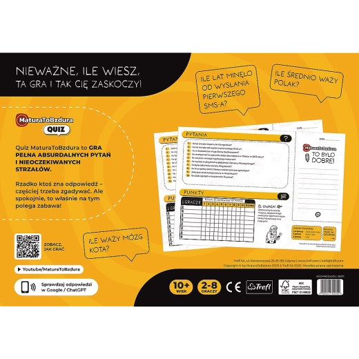 Il divertente gioco a quiz Matura To Bzdura di Trefl porta centinaia di domande inaspettate che mettono alla prova non solo le conoscenze, ma anche l’intuito e il senso dell’umorismo. Una scelta perfetta per feste, incontri con amici e serate in famiglia, dove contano prontezza di pensiero e sana rivalità.