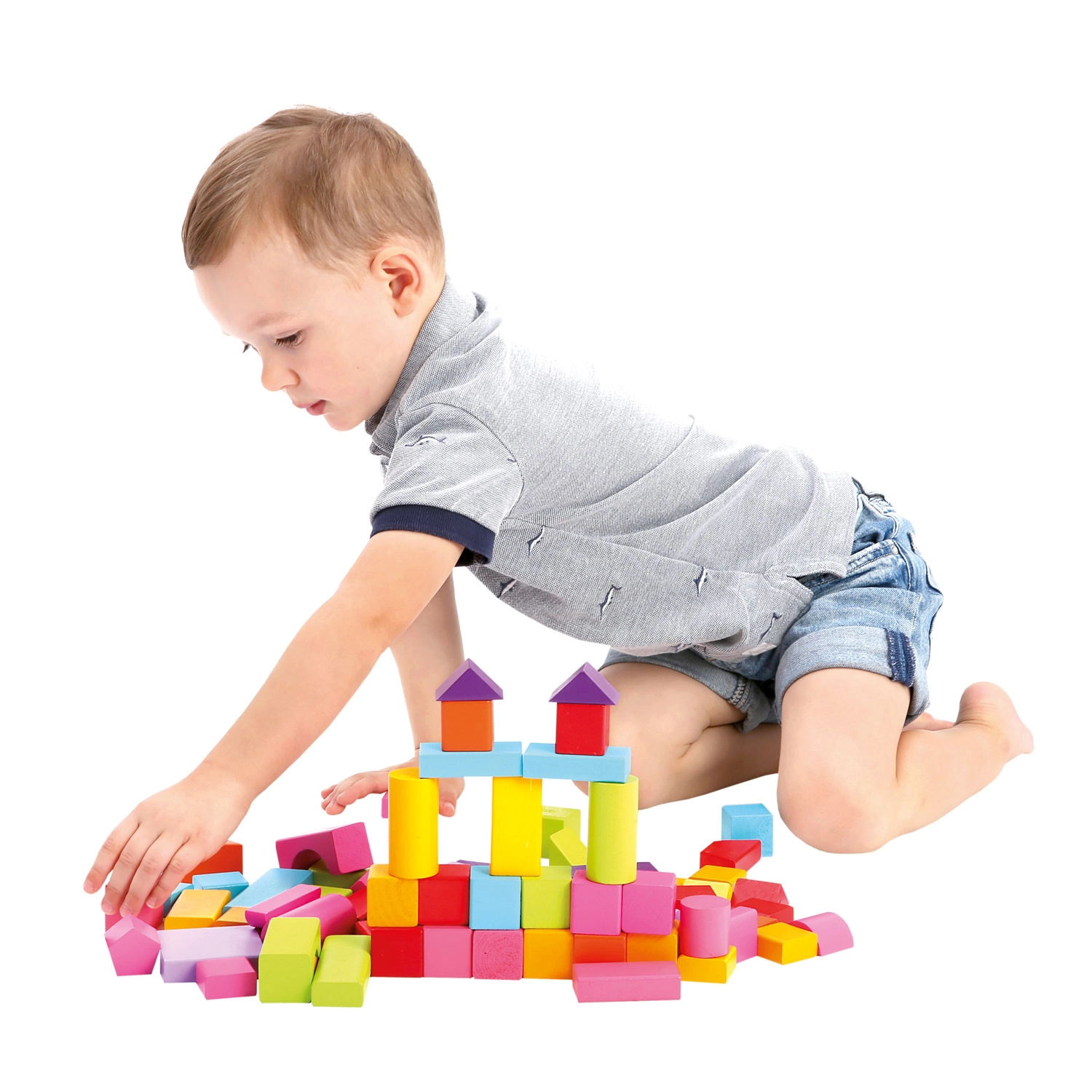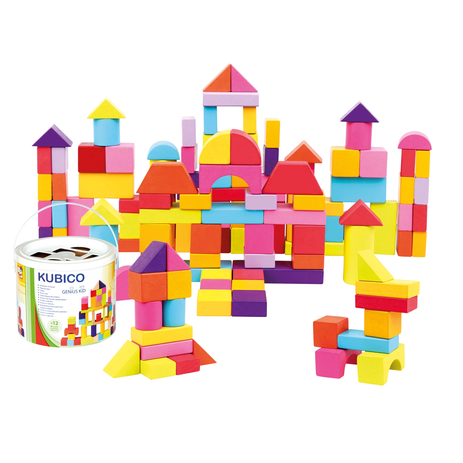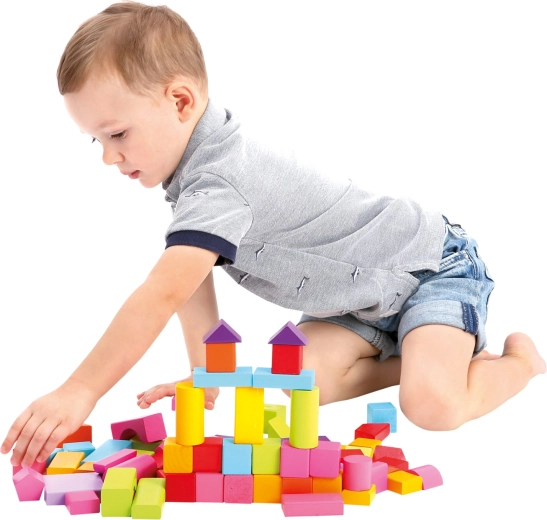 Ideale dai 1 anni in su: i blocchi hanno una superficie piacevolmente liscia, colori vivaci e atossici e una varietà di forme – da cubi e parallelepipedi a cilindri, archi e triangoli. Il gioco con i blocchi sviluppa percezione spaziale, creatività e coordinazione occhio–mano.