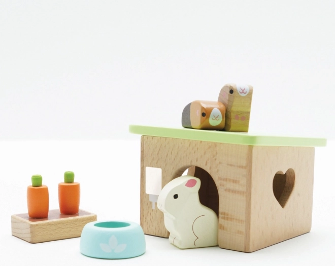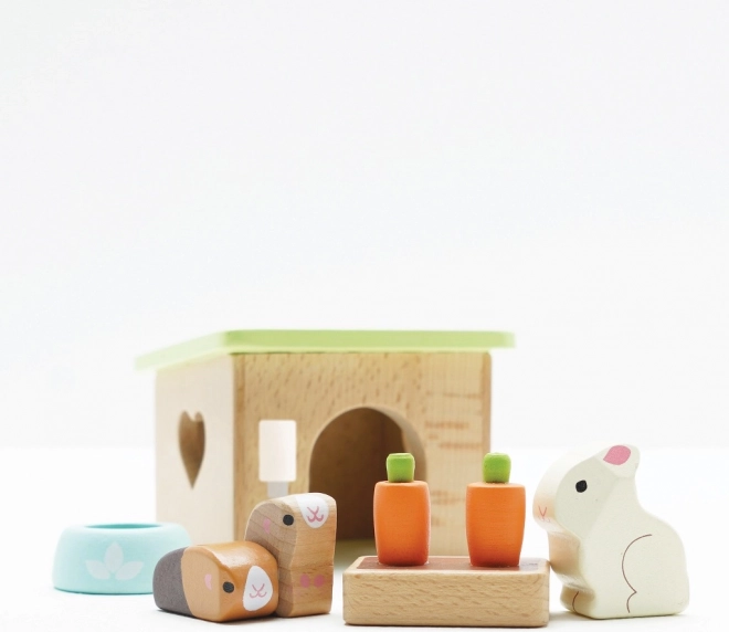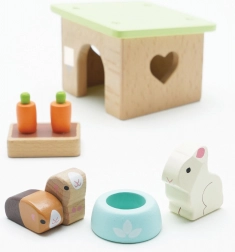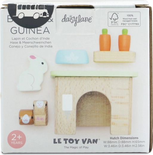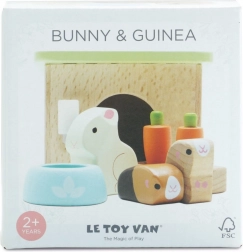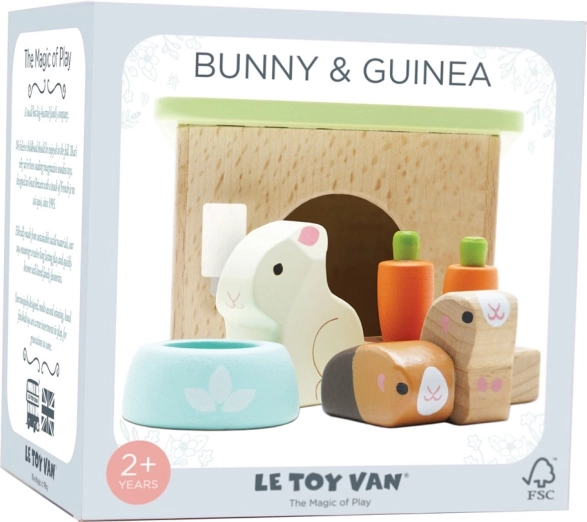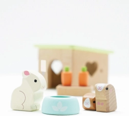 Adorabile set in legno di piccoli animali domestici di LE TOY VAN con un coniglietto, due caviette, una cuccia, una ciotola e snack di carota per ore di gioco di ruolo creativo. Realizzato in legno FSC sostenibile, rifinito a mano con vernici atossiche a base d’acqua – una scelta sicura e stilosa per bambini dai 2 anni.