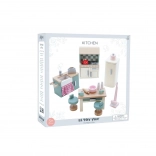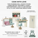La cucina perfetta per la casa delle bambole di Le Toy Van. Questo splendido set in legno include tutto il necessario per avventure culinarie in miniatura - lavello, piano cottura, forno, frigorifero e tavolo con sedie. Tutto realizzato a mano con materiali sostenibili.