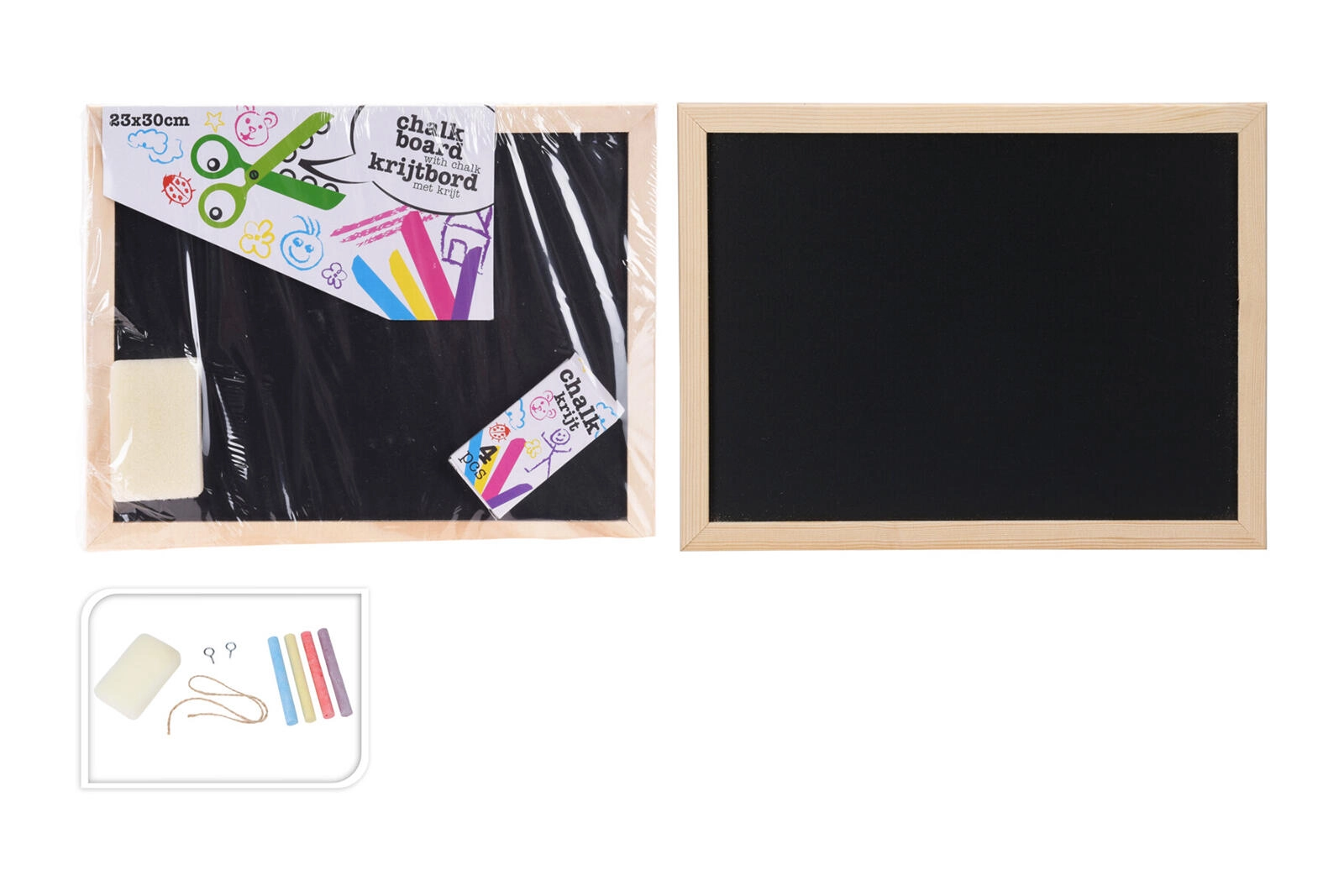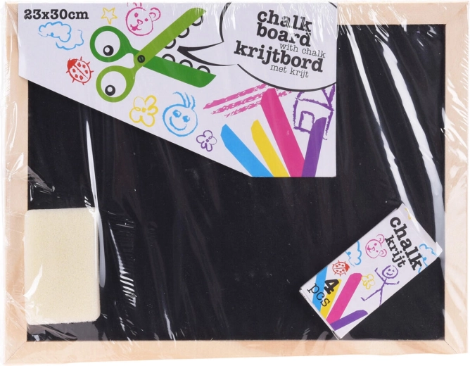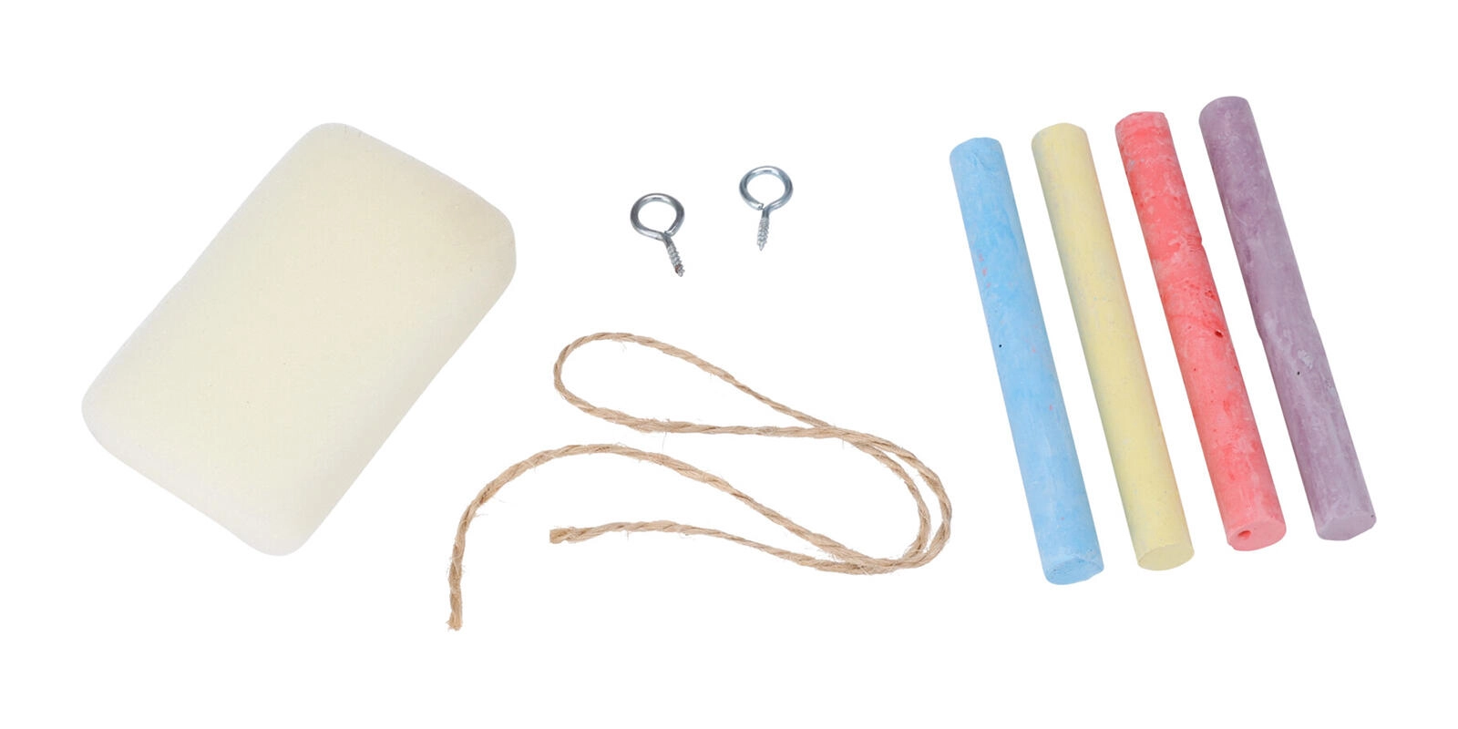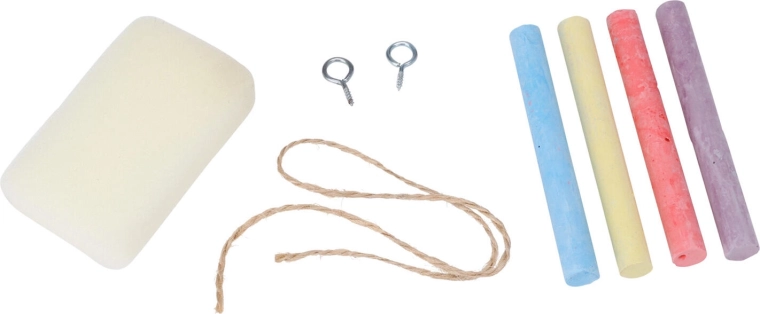 Il set comprende 4 gessetti colorati (giallo, rosso, viola, blu) e una spugnetta per cancellare facilmente, così puoi scrivere e disegnare subito dopo l’apertura. La superficie della lavagna consente una scrittura fluida e una pulizia semplice.