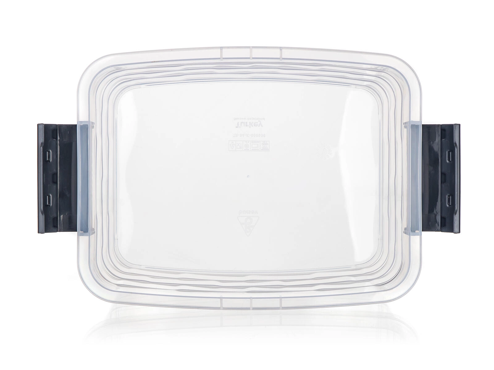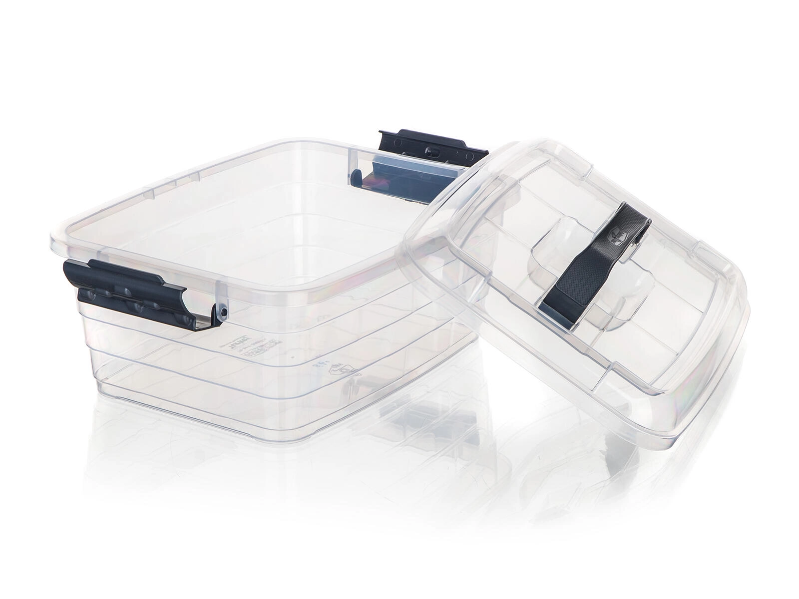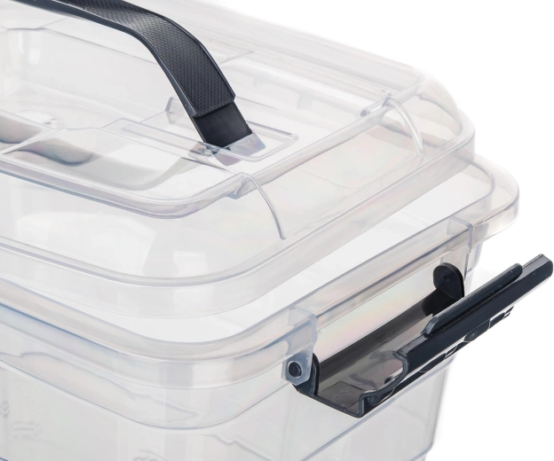 Le robuste clip fumé fissano saldamente il coperchio al corpo della scatola e proteggono gli oggetti dalla polvere e da aperture accidentali.