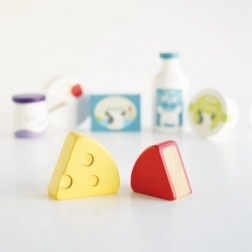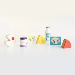 Arricchisci il gioco dei bambini con una scatola di legno con prodotti lattiero-caseari che include latte, burro, yogurt e formaggi. Ottima per lo sviluppo dell'immaginazione e delle abilità motorie.