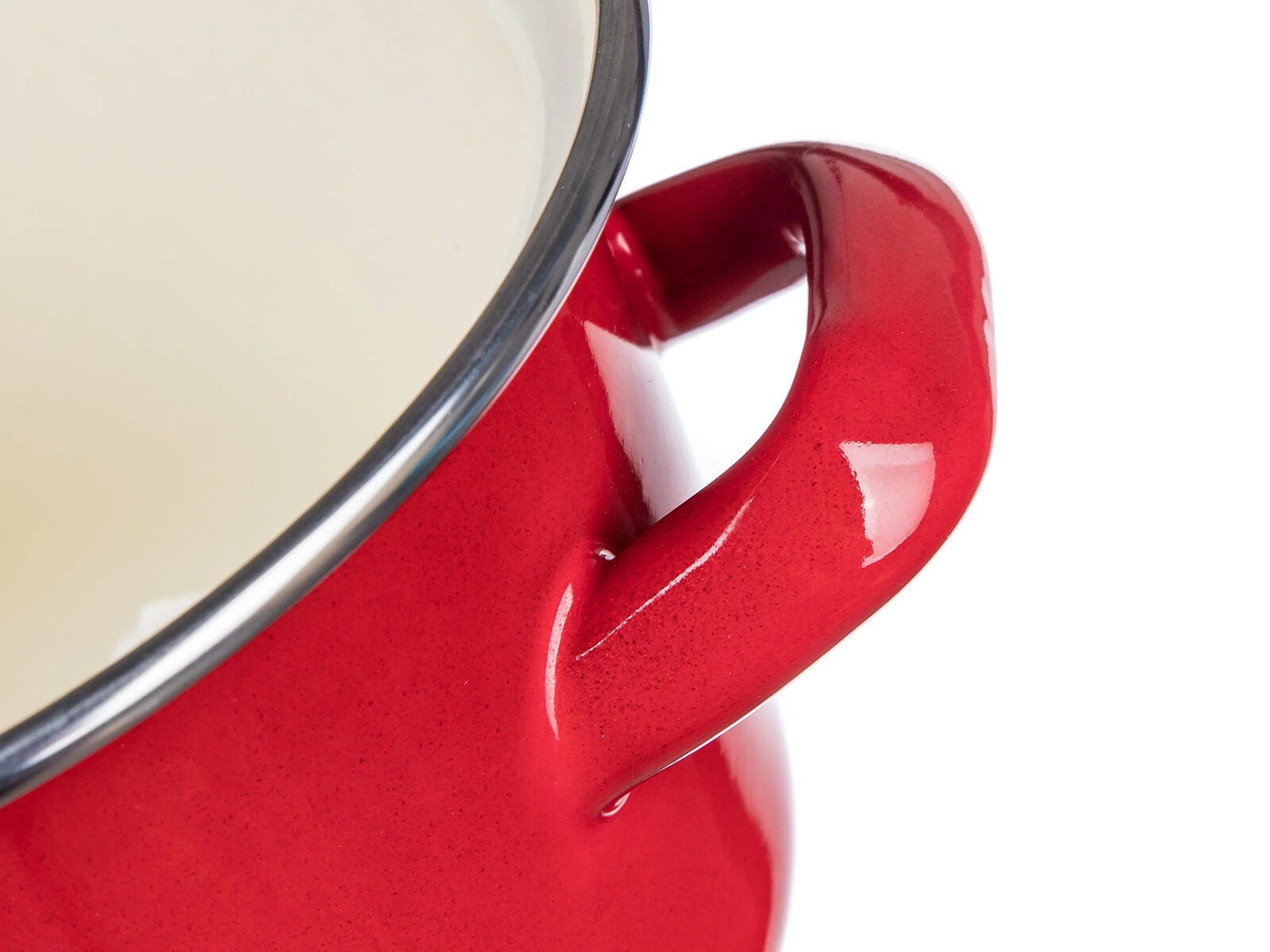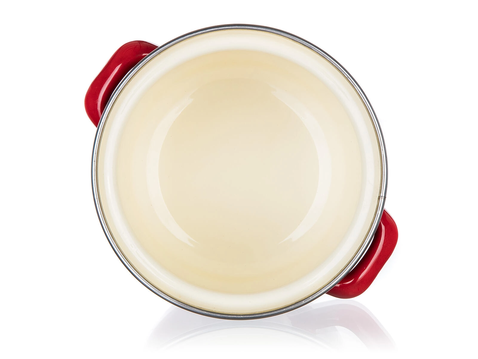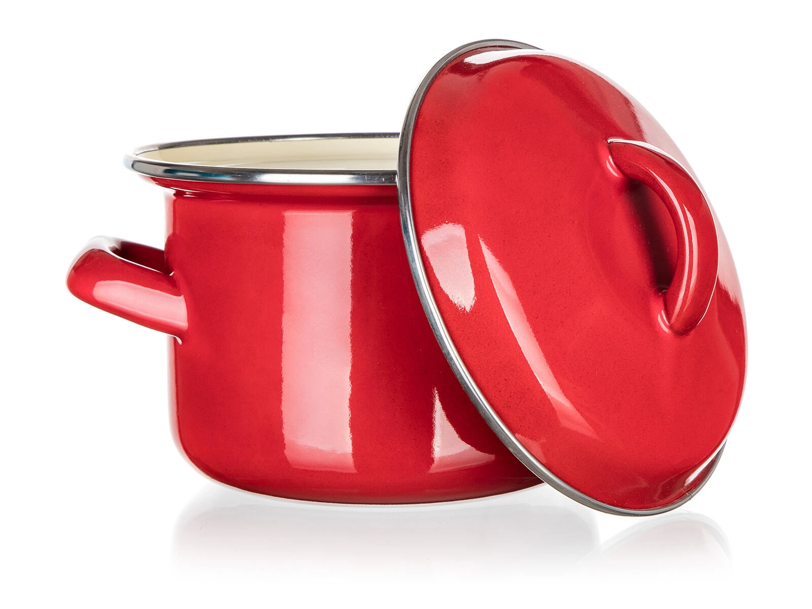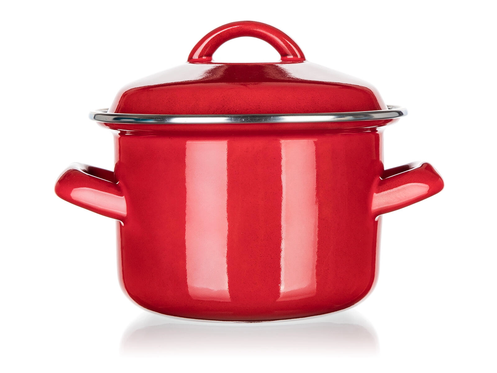 Compatta pentola smaltata con coperchio, capacità 0,78 l e diametro 12 cm, ideale per piccole porzioni, salse o per riscaldare. La resistente smaltatura in colore rosso, l’interno color crema e il fondo universale per tutti i tipi di piani cottura, inclusa l’induzione garantiscono cottura facile e lunga durata.