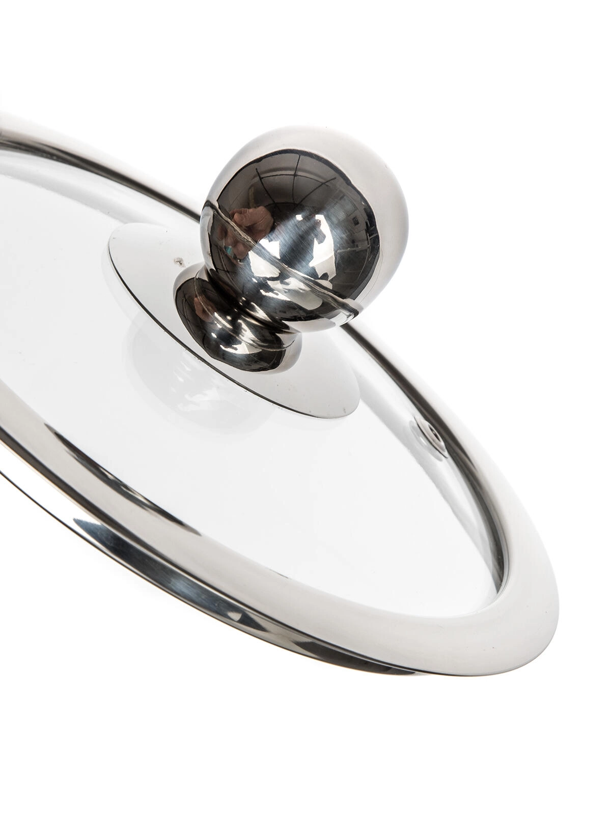 Il coperchio trasparente in vetro temperato con pomolo in metallo trattiene calore e vapore all’interno, mentre consente di monitorare la cottura senza sollevare il coperchio.