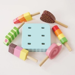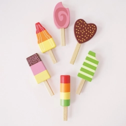 Sei ghiaccioli in legno dipinti a mano, con colori e forme allegre, stimolano la fantasia e invogliano a infinite interpretazioni del ruolo del gelataio.