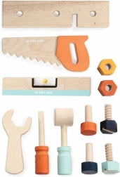 Sega, martello, cacciavite, chiave, livella, viti, bulloni, chiodi e piastrina – accessori perfetti per le mani dei bambini.