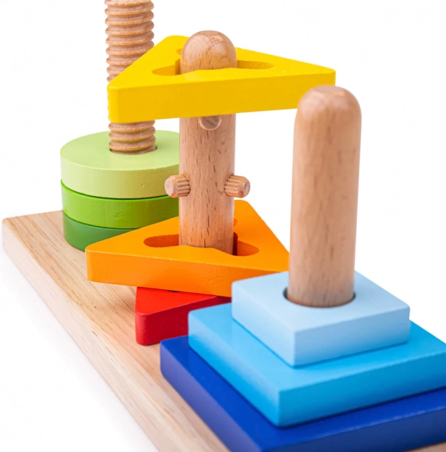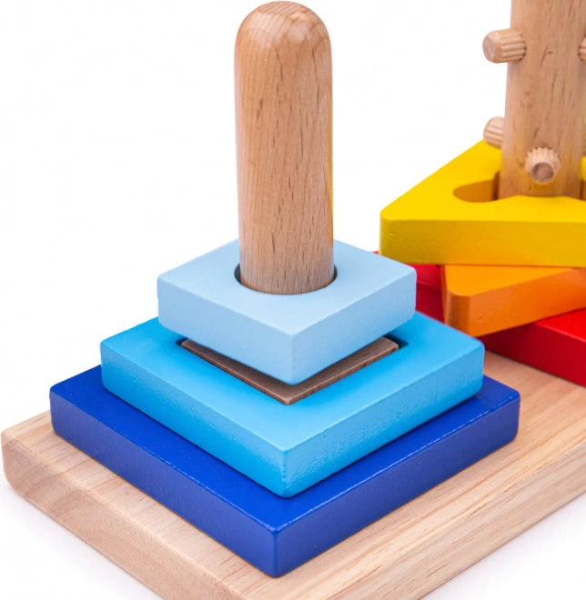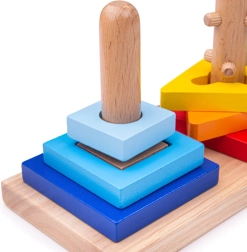 Ogni piolo ha una struttura diversa per cerchi, triangoli e quadrati: i bambini devono infilare correttamente i pezzi e spesso anche ruotarli.