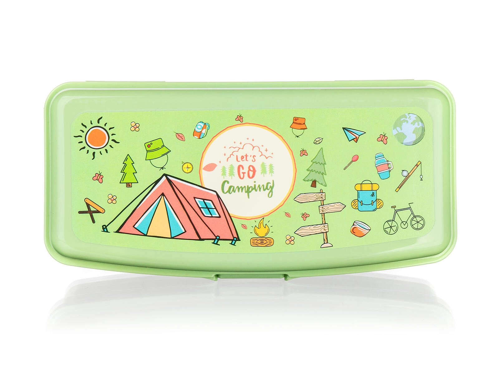 Pratico porta pranzo di colore verde con motivo CAMPING, ideale per la scuola e le gite. Grazie alle dimensioni compatte e alla chiusura a scatto affidabile conserva in sicurezza panini, frutta e piccole golosità. La plastica resistente si pulisce facilmente e la forma della scatola è perfetta per un panino o una banana.