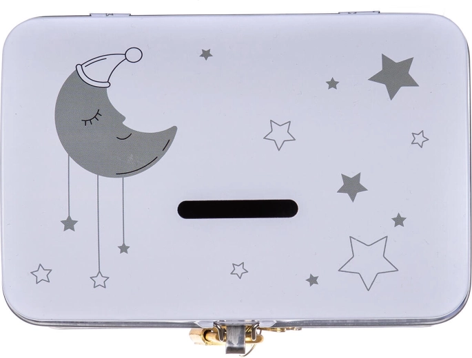 Stiloso salvadanaio in latta a forma di scrigno che aiuta bambini e adulti a risparmiare con regolarità. Dispone di chiusura sicura, coperchio removibile per un facile prelievo delle monete e elegante design bianco con stelline, adatto a qualsiasi stanza.