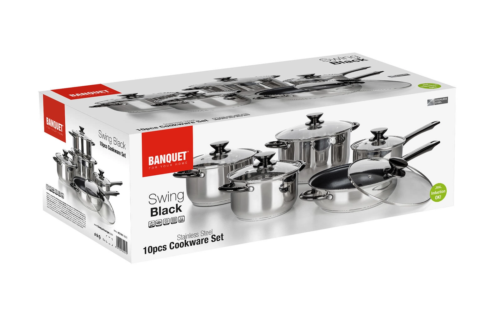 Il set di pentole SWING Black offre un equilibrio tra resistenza, funzionalità e design moderno. Il corpo in acciaio inox con fondo sandwich multistrato garantisce una distribuzione uniforme del calore e prestazioni affidabili su tutti i tipi di piani cottura, inclusa l’induzione. I coperchi in vetro con foro di sfiato permettono un controllo preciso della cottura.