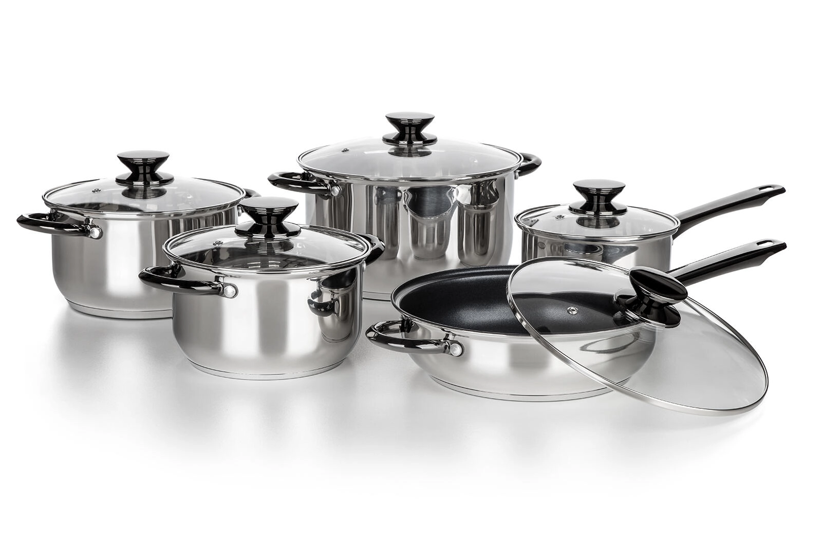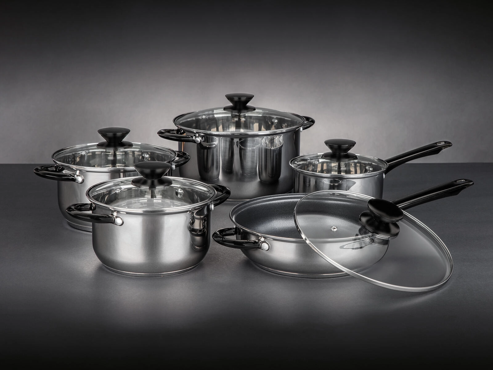 Completo set di pentole SWING Black da 10 pezzi in acciaio inossidabile di qualità per la cucina quotidiana. Include pentole, casseruola e padella con rivestimento antiaderente, tutte con coperchi in vetro resistenti con foro per il vapore. Adatto a tutti i tipi di piani cottura, inclusa l’induzione, con finitura lucida e eleganti dettagli ramati. Facile manutenzione, lavabile in lavastoviglie.