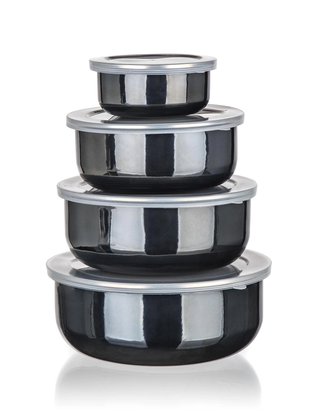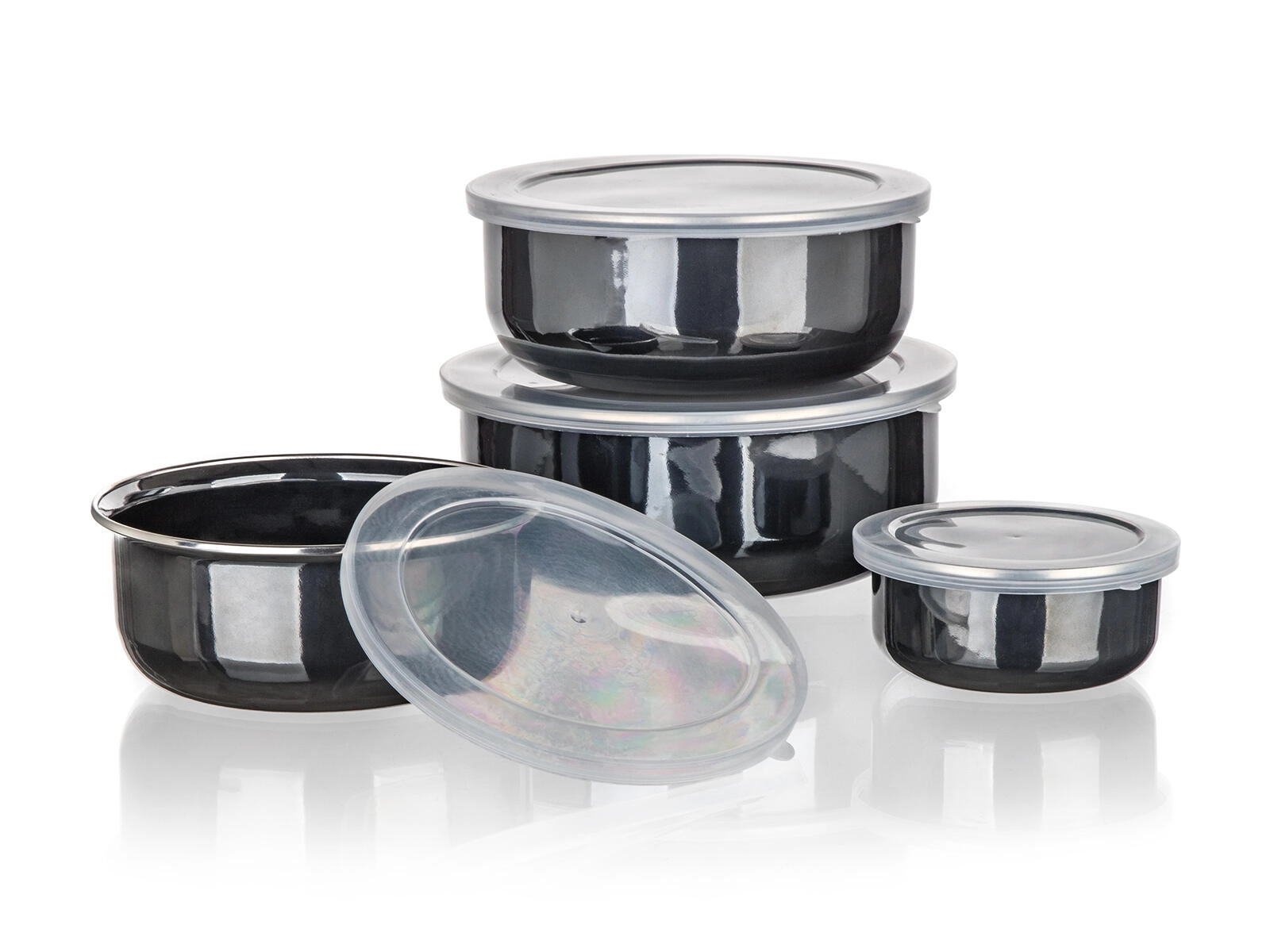 Pratico set di ciotole smaltate con coperchi in plastica METALIC Black in elegante colore nero per l'uso quotidiano. Quattro dimensioni con impilamento una nell'altra per risparmiare spazio, coperchi ermetici per mantenere gli alimenti freschi più a lungo e smalto resistente per una facile manutenzione. Ideali per conservare gli alimenti in frigorifero e in viaggio.