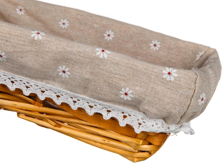 Il cestino Daisy combina la tradizionale intrecciatura in vimini con una morbida fodera tessile dal motivo di piccole margherite. Grazie all’aspetto naturale e al pizzo discreto, si integra perfettamente in interni in stile rustico, country o scandinavo. È indicato soprattutto per un uso decorativo: per pane, frutta, tovaglioli, cosmetici o piccoli articoli per la casa.