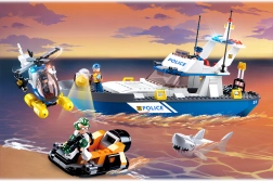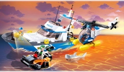 Questo set include una nave, un elicottero e altri elementi per missioni di salvataggio e polizia, offrendo infinite possibilità di gioco.