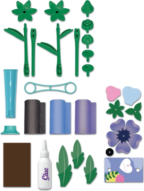 - Steli, petali da colorare, foglie da assemblare, connettori, supporti per fiori, colla, bigliettino con supporto