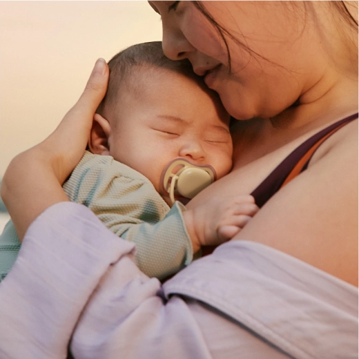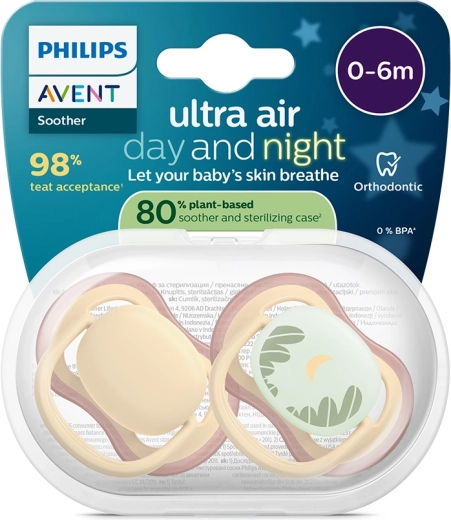 La pratica custodia per sterilizzazione e trasporto consente un’igienizzazione rapida nel microonde in 3 minuti. La linea Ultra Air è anche più sostenibile grazie a fino all’80% di materiali di origine vegetale nelle parti rigide. I ciucci sono realizzati in silicone 100% per uso alimentare, privi di BPA, BPS, ftalati e PVC.