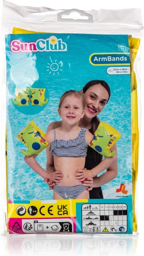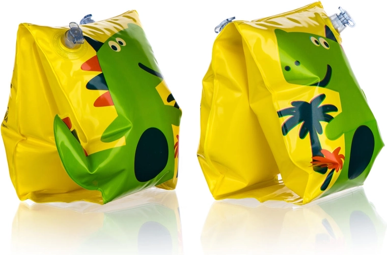 I braccioli giallo brillante con un simpatico dinosauro incoraggiano il piacere di nuotare e aumentano la visibilità del bambino in acqua.