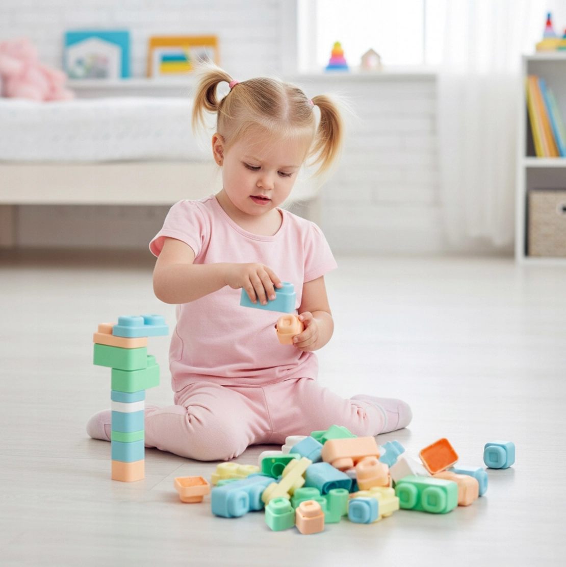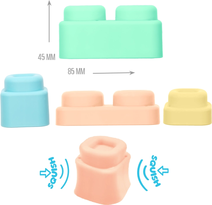Il materiale è morbido, elastico e certificato, così i bambini possono schiacciare, mordicchiare o lanciare cubi e tappetini in sicurezza, senza rischio di ferirsi. I pezzi si collegano e scollegano facilmente, rafforzando la motricità fine, la coordinazione mano-occhio e l’autonomia durante il gioco.