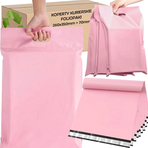 Pratiche buste corriere rosa in LDPE con manico fustellato per un trasporto comodo. Offrono chiusura sicura grazie alla striscia autoadesiva, resistenza agli strappi e protezione della privacy grazie al materiale opaco. Ideali per spedizioni e‑commerce e confezioni regalo, dimensioni 260 × 350 + 70 mm, confezione da 50 pz.