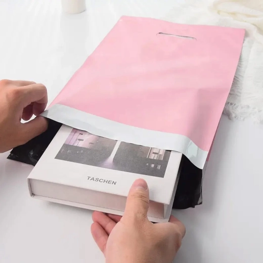 Questi poly mailer rosa con manico fustellato integrato combinano leggerezza, resistenza ed eleganza. La struttura a doppio strato con interno scuro assicura opacità e riservatezza del contenuto, mentre la striscia autoadesiva con chiusura peel‑and‑seal consente un imballaggio rapido e sicuro senza bisogno di strumenti aggiuntivi.