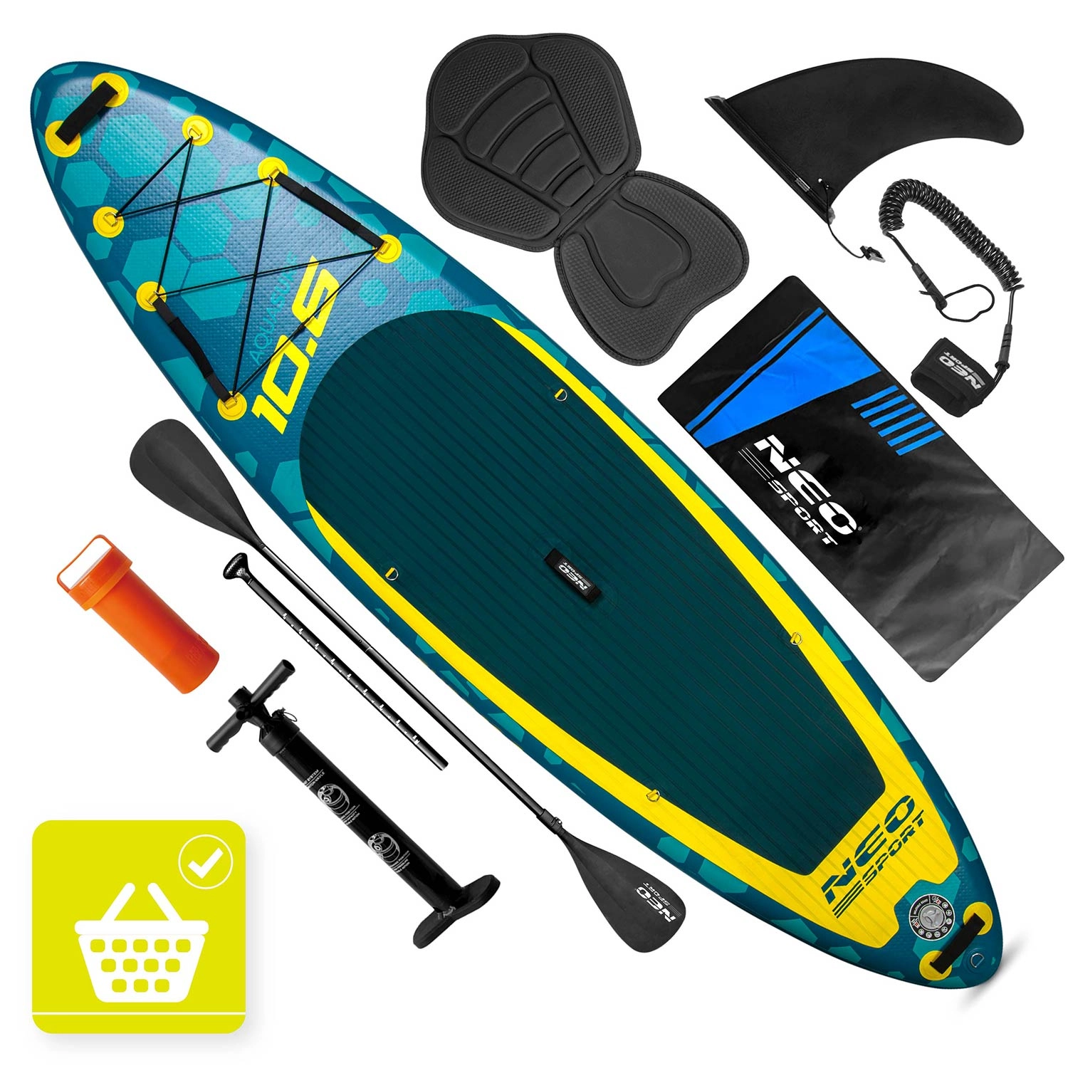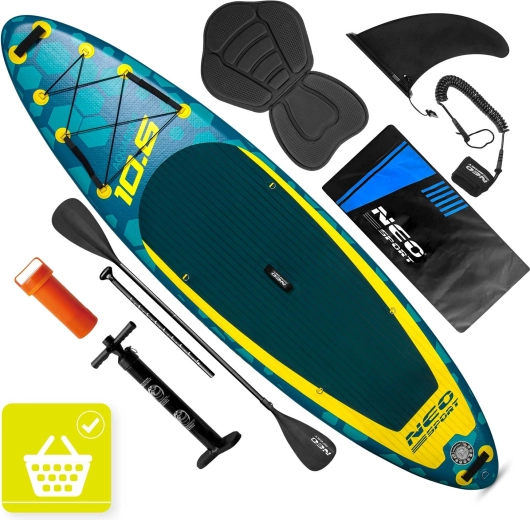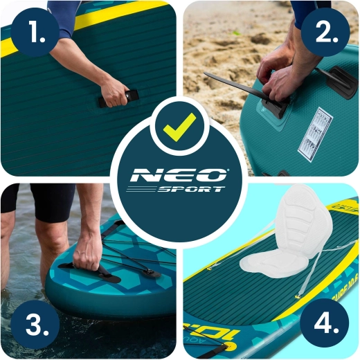 Nel set trovi una pompa a doppia azione con manometro per un gonfiaggio rapido e sicuro, una pagaia in alluminio regolabile (162–210 cm) con bloccaggio rapido, un leash di sicurezza con snodo girevole anti‑attorcigliamento, la pinna centrale rimovibile, un kit di riparazione e un robusto zaino da trasporto con materiale rinforzato. Con una portata fino a 140 kg, il SUP è adatto a rider di diverse altezze e corporature e a un carico leggero.