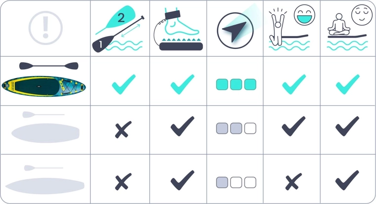 Ampia superficie, pinna centrale rimovibile e stabilizzatori laterali agevolano la direzionalità e le curve – ideale su acque calme e piccole onde.