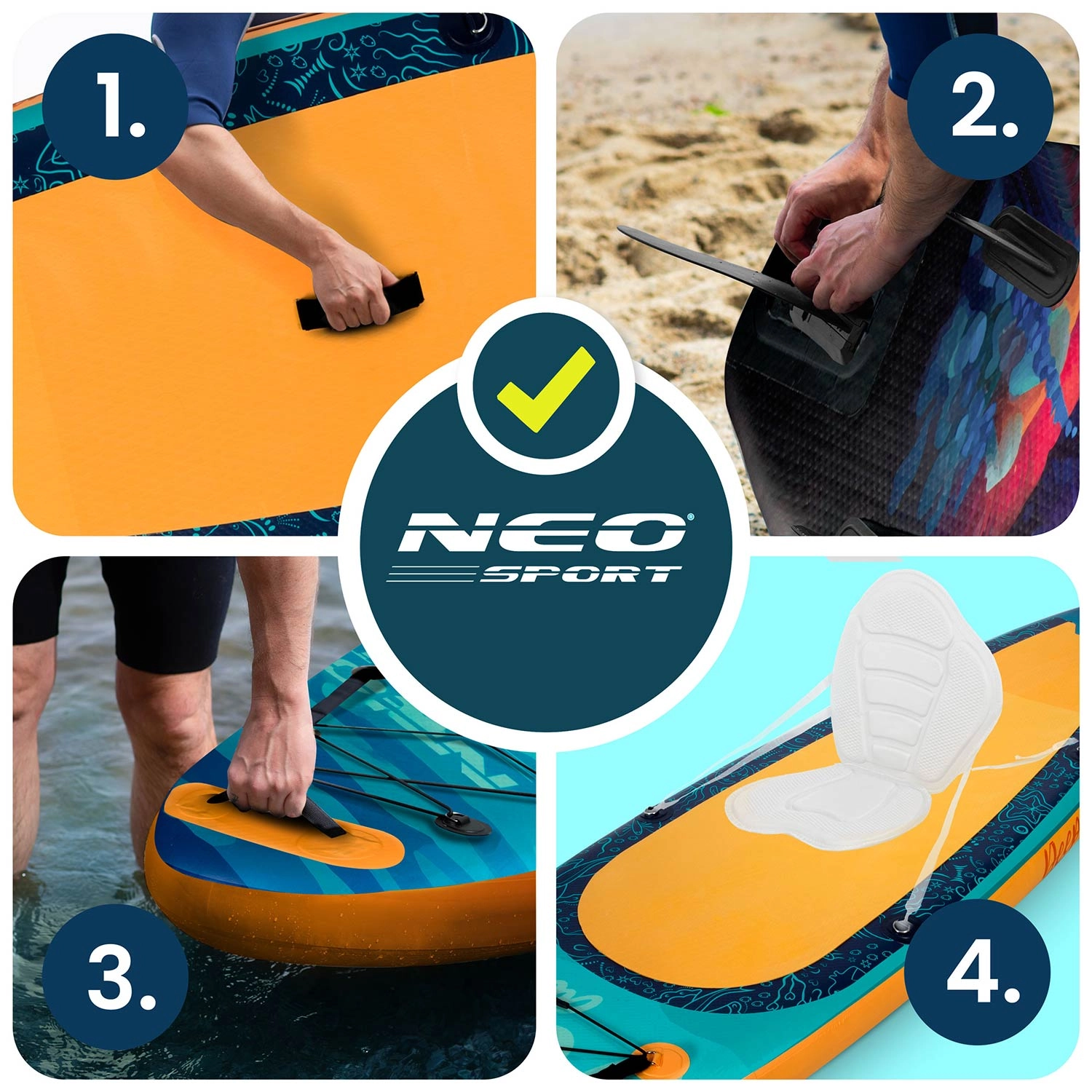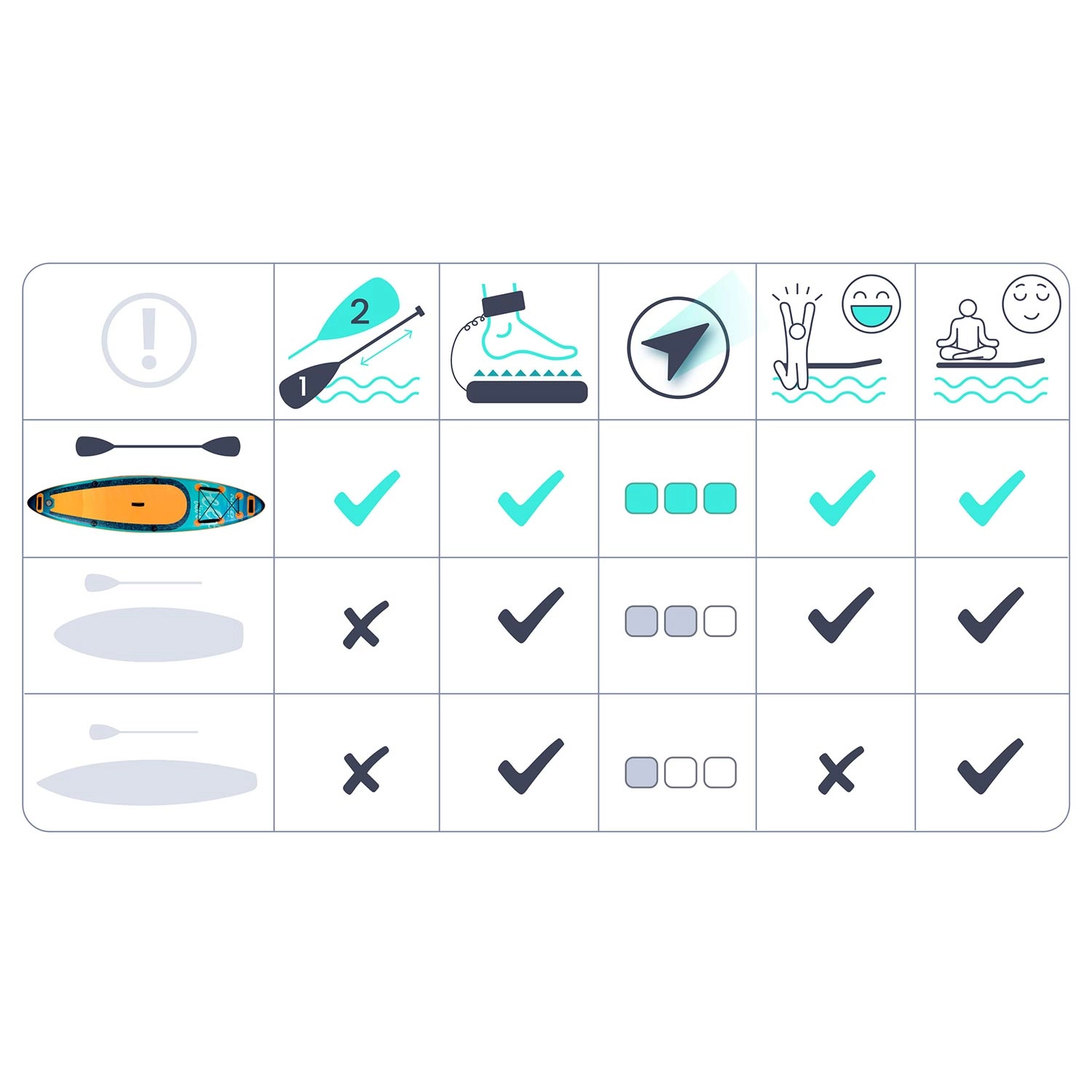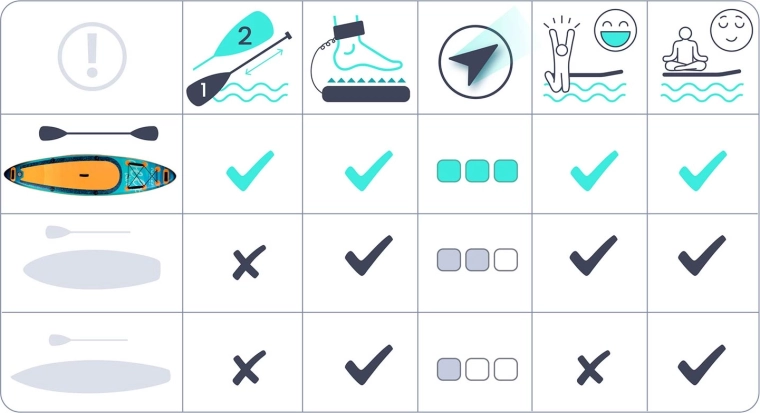 Incluso tutto per partire subito: pagaia, pompa, leash, pinna rimovibile per una migliore stabilità direzionale, kit di riparazione e ampio zaino in materiale resistente. Ideale per svago, fitness, yoga e tranquille gite su laghi e corsi d’acqua lenti.