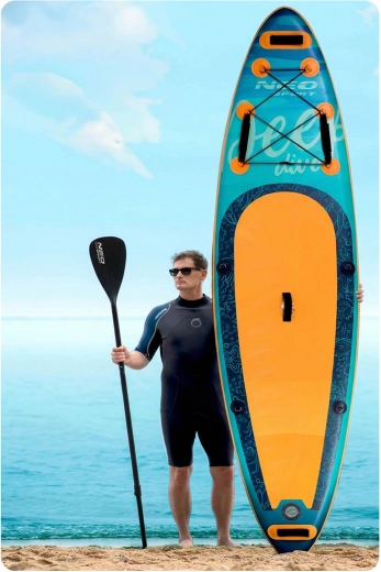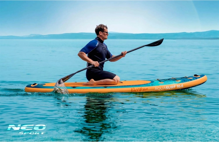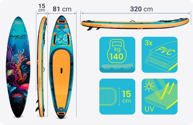 Il SUP gonfiabile Aquasurf 10'6 (320 × 84 × 15 cm) è una tavola universale per acque calme e piccole onde. Grazie allo spessore di 15 cm offre grande stabilità, mentre l’EVA antiscivolo copre gran parte del ponte per una posizione sicura anche a piedi nudi. L’portata fino a 140 kg consente di uscire in acqua con equipaggiamento o con un bambino. Il robusto PVC a 3 strati con tecnologia Drop Stitch Light e il rivestimento resistente ai raggi UV prolungano la durata; i bordi rinforzati aumentano la resistenza agli urti.