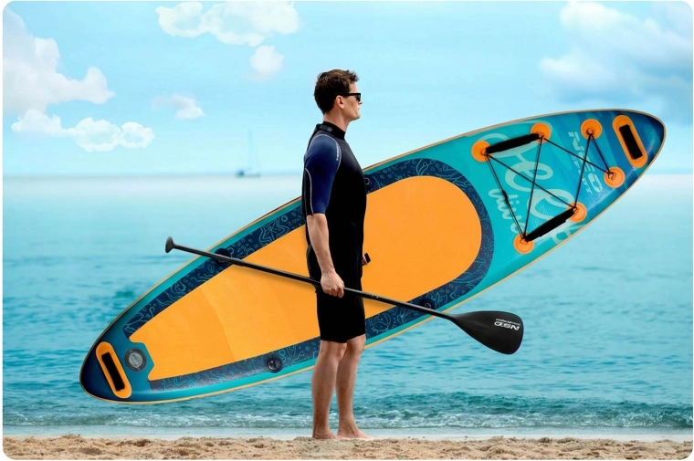 Nella confezione trovi SUP, pinna rimovibile, pagaia regolabile, pompa a doppia azione con manometro, leash a spirale, kit di riparazione e zaino resistente. Si ripone facilmente, si trasporta e si parte.