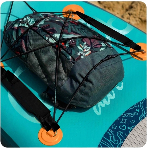 Nella parte anteriore è presente una pratica rete cargo elastica per zaino, giacca o borraccia. La pagaia in alluminio regolabile (162–210 cm) si blocca rapidamente con chiusura a leva e si adatta a corporatura e stile di pagaiata. La pompa a doppia azione con manometro velocizza il gonfiaggio e permette il controllo preciso della pressione. Il leash con snodo girevole non si attorciglia e ti mantiene al sicuro. Tre maniglie facilitano il trasporto verso la spiaggia e in auto.