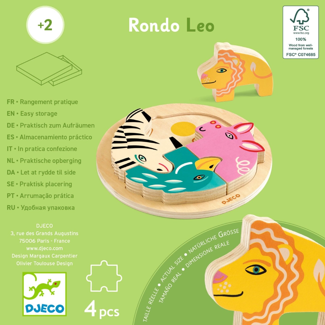 DJECO Rondo Leo è un puzzle in legno di qualità progettato per bambini dai 2 anni. La base rotonda con scanalature guida e spazi chiaramente contrassegnati aiuta i piccoli a incastrare intuitivamente quattro pezzi animaletto ben definiti. Grazie a componenti spessi e facili da afferrare, i bambini imparano giocando e sviluppano abilità importanti.